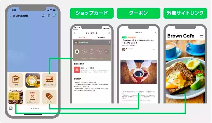 このメニューには、LINE内のクーポンやショップカードの機能だけでなく、外部のECサイトや予約ページなど、Webサイトへのリンクも自由に設定できます。